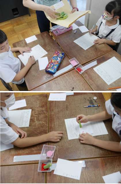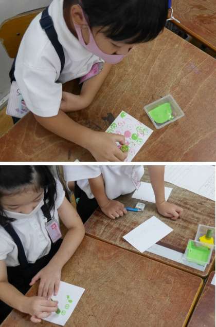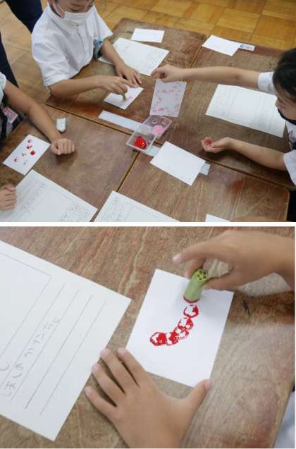 1年生が、先生の持ってきたオクラを輪切りにしてもらって、絵具でスタンプみたいに画用紙に押してみました。どんな形になりましたか。いろいろな色でスタンプを重ねていきます。