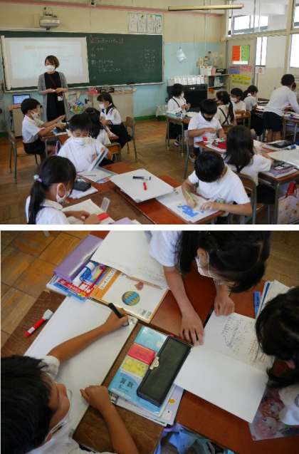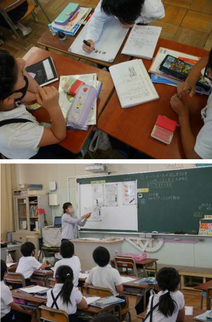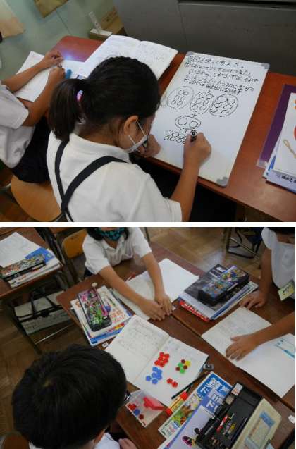 3年生の算数では、「スーパーボール20個を袋に6個ずつ入れると何袋になるか」を考えています。かけ算を使って考えていきます。ホワイトボードに図を使って考えを描いています。