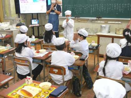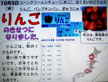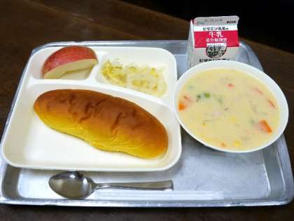 今日の献立は、コーンクリームシチュー、白菜のピクルス、りんご、パンプキンパン、牛乳でした。
