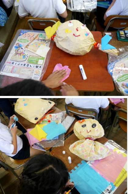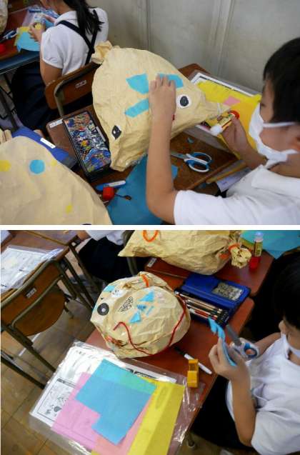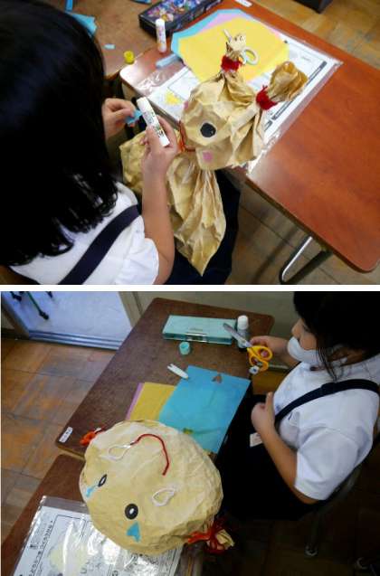 2年生では、クラフト紙袋をくしゃくしゃにして、中に新聞紙をつめた造形物を作っています。もうすぐ完成です。