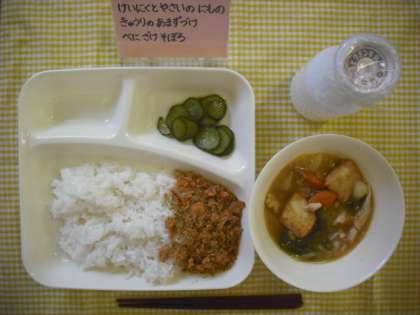 今日の献立は、「鶏肉と野菜の煮もの、きゅうりの甘酢づけ、紅ざけそぼろ、ごはん、牛乳」です。紅ざけそぼろは、ごま、紅ざけフレーク、青のりを使ったごはんに合う1品です。