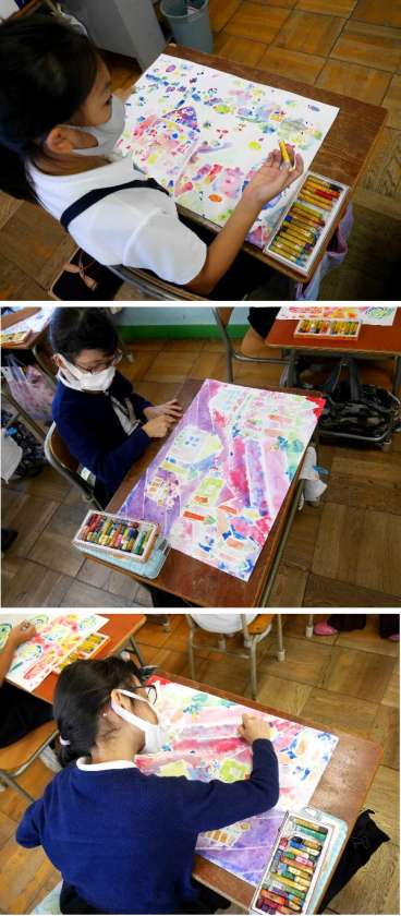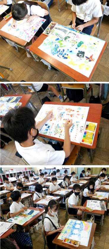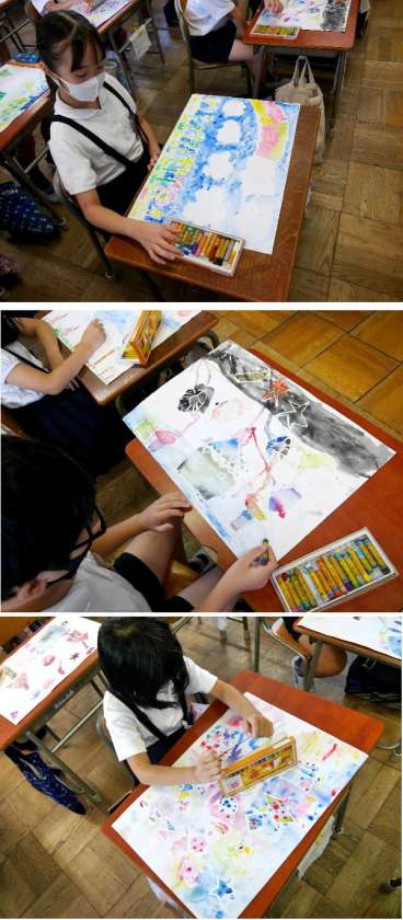 絵具を水でにじませて、にじみの効果で描いた世界を表してみました。最後の仕上げです。とてもきれいに仕上がっていますね。