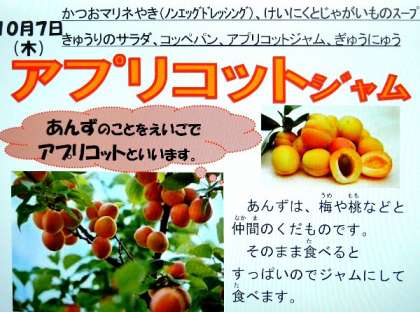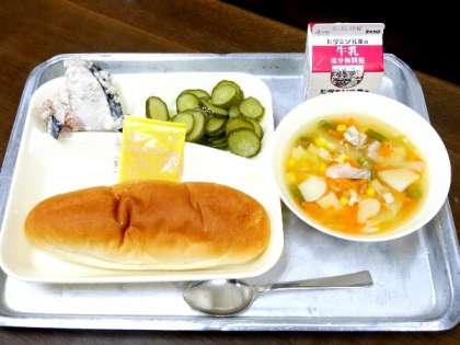 今日の献立は、かつおマリネ焼き、鶏肉とじゃがいものスープ、きゅうりのサラダ、コッペパン、アプリコットジャム、牛乳でした。
