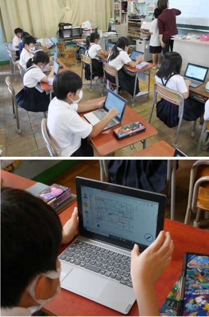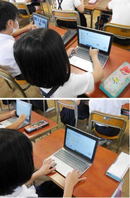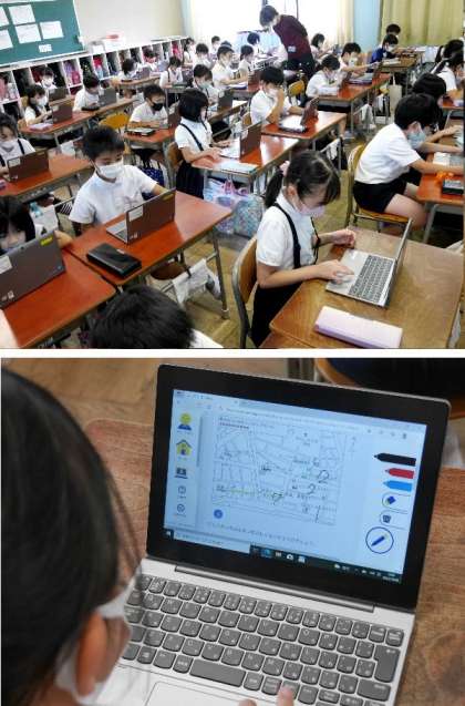 3年生がデジタルドリルで社会のふりかえり学習をしています。パネルタッチでも操作できるので、操作にも慣れてがんばっています。