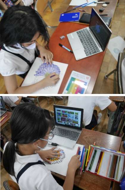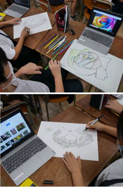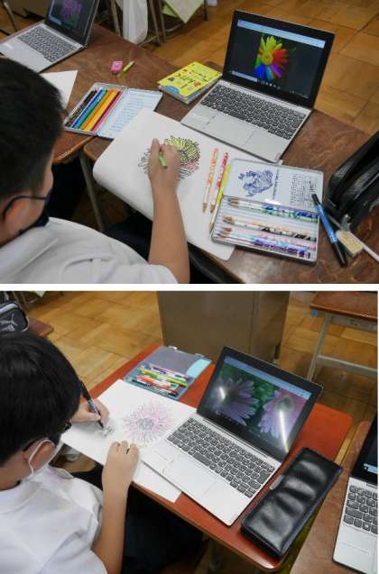 パソコンで世界のカラフルできれいな花を探して絵を描いています。かなり細かい絵にも集中力で書き込んでいっています。