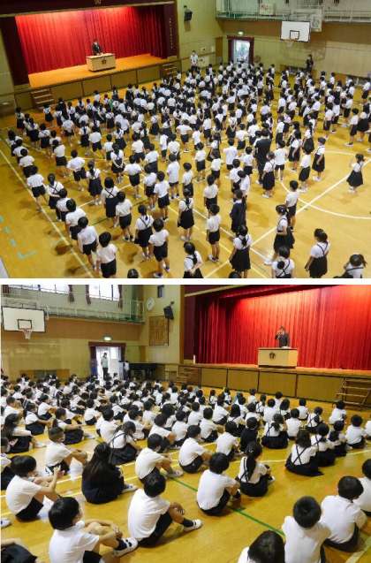 緊急事態宣言が解除され、今年度、はじめて全校朝会を講堂で行いました。ただ、当面のあいだは、1〜3年と4〜6年と分割して隔週で行います。