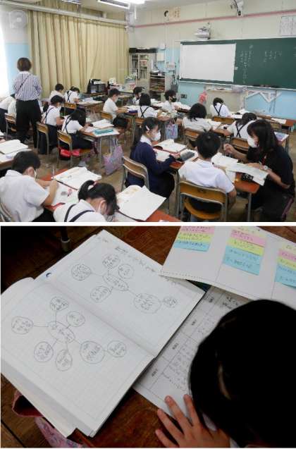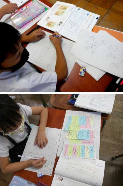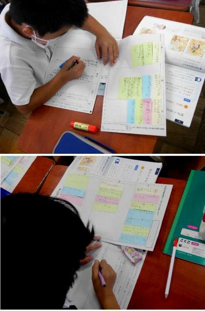 3年生の国語では、想像を広げて物語を書いていく額私有をしています。物語の設計で順番を考えて物語を作っていきます。付箋を使って順番を入れ替えたりしながら考えて作っていきます。