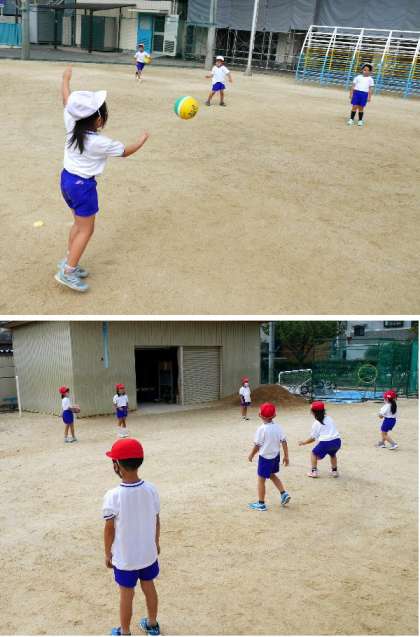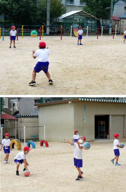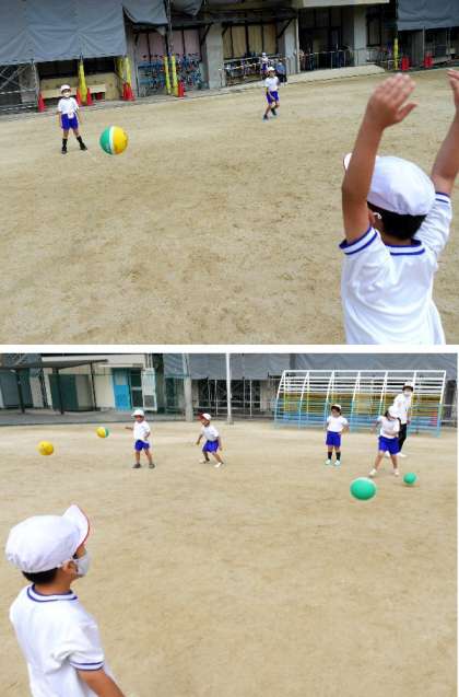 1年生ではボールを使った競技をするために、投げる練習をしています。