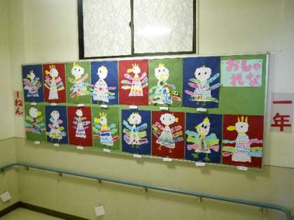 1年生の掲示板に「おしゃれな鳥」が掲示されました。カラフルですね。