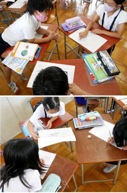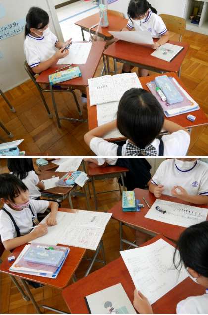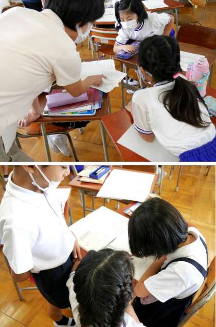 3年生の少人数別の算数の授業です。算数の問題を計算にして解きます。その説明をわかりやすく、友だちにできるように練習しています。