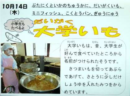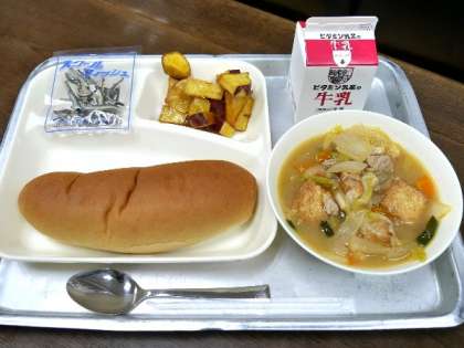 今日の献立は、豚肉といかの中華煮、だいがくいも、ミニフィッシュ、黒糖パン、牛乳でした。