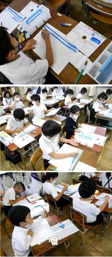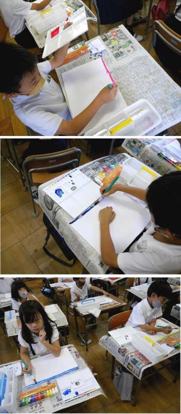 2年生が、新しい絵具道具をだして、初めて絵具を使います。おそるおそる筆を水につけて、絵具をつけて練習しています。まだ、水の調整量がわからないみたいですが、少しずつ慣れていきましょう。