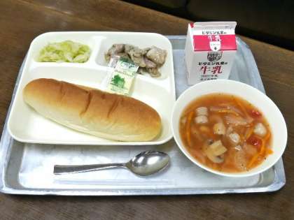 今日の献立は、鶏肉の香草焼き、ウインナーとてぼ豆のスープ、キャベツのガーリックソテー、コッペパン、マーガリンでした。