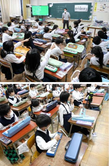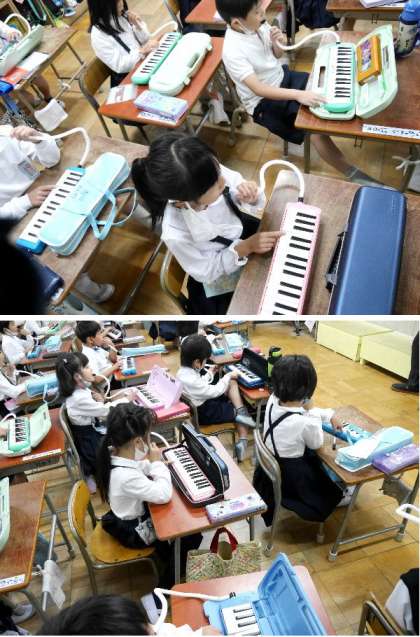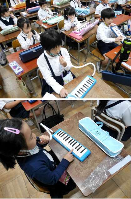 1年生が鍵盤ハーモニカで音を出しています。ここが低い「ド」で、ここが高い「ド」だねと、確認しながら音を出す練習をしました。