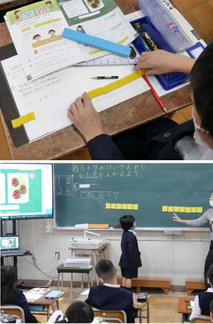 1年生の計算もむずかしくなってきました。16+7の計算、どんなふうに頭で計算していますか、いろいろな方法がありますね。ブロックを使って具体的に考えていきます。自分の考えをみんなに伝えてみましょう。