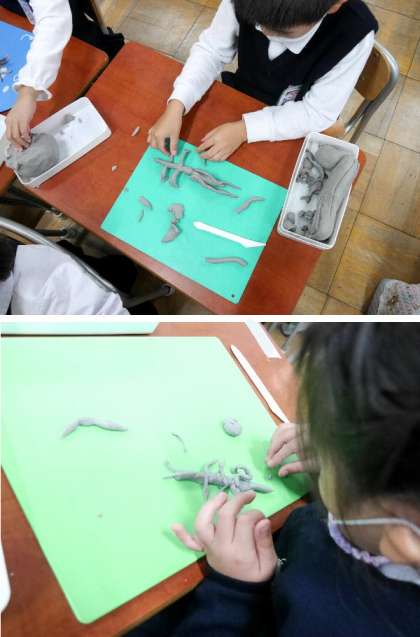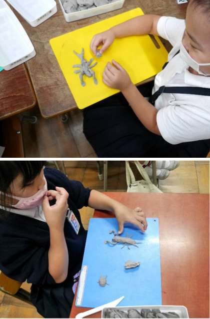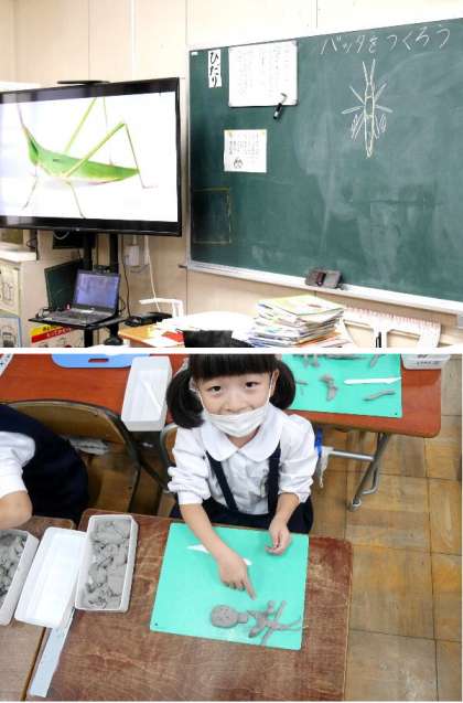 1年生がねんどで作っています。今日のお題は「バッタ」です。なかなかむずかしいですね。足のかたちがたいへんです。