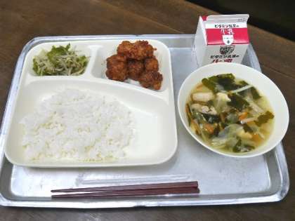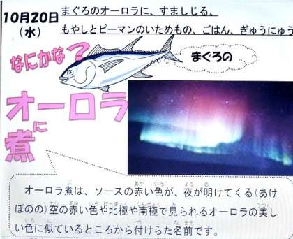 今日の献立は、まぐろのオーロラ煮、すまし汁、もやしとピーマンのいためもの、ごはん、牛乳でした。