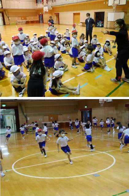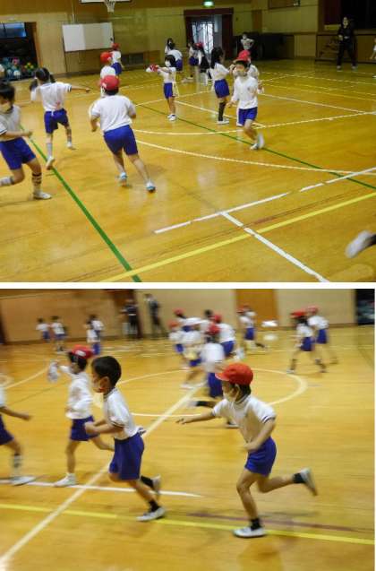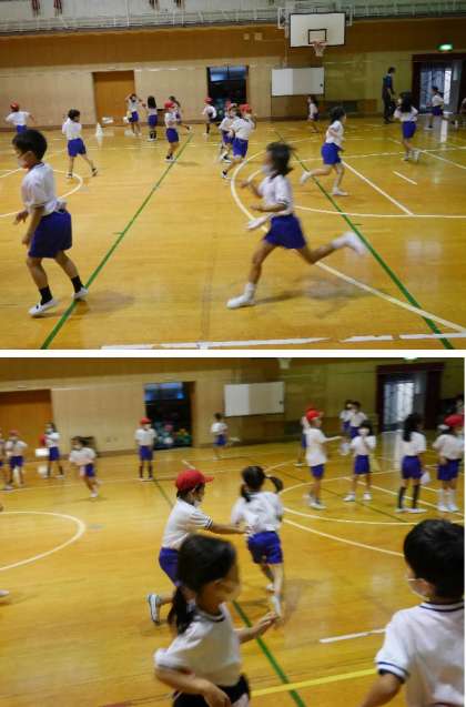1年生が体育館で鬼ごっこ。赤い帽子が鬼です。その他の人は帽子をズボンにはさんでおきます。鬼から帽子をとられないように逃げるのです。元気いっぱいです。