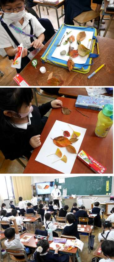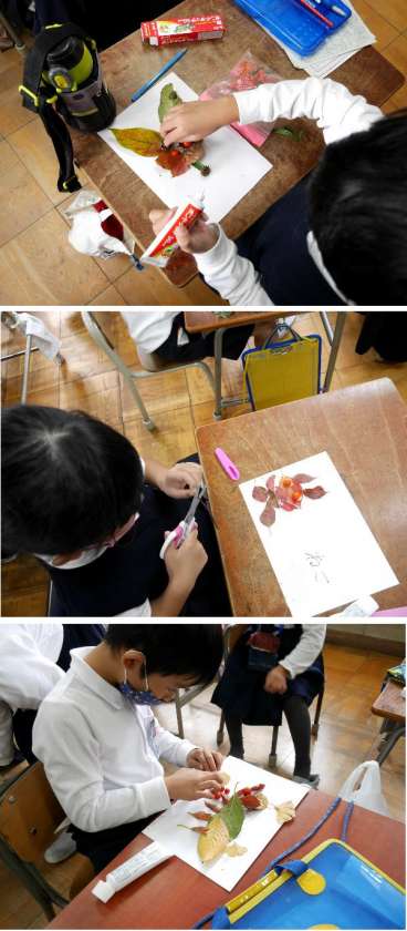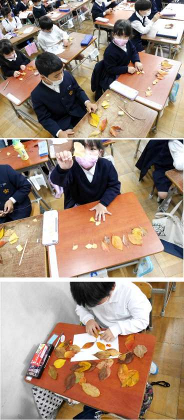 1年生は都島公園に出かけて、落ち葉などをひろってあつめてきました。その材料を使って、作品を作っています。とてもいい作品ができあがっています。