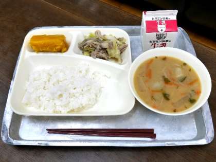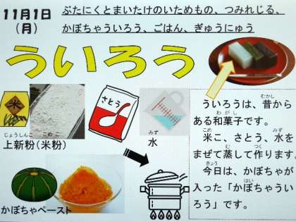今日の献立は、豚肉とまいたけの炒め物、つみれ汁、かぼちゃういろう、ごはん、牛乳でした。月はじめの今日は、各委員会からの報告が各教室でありました。