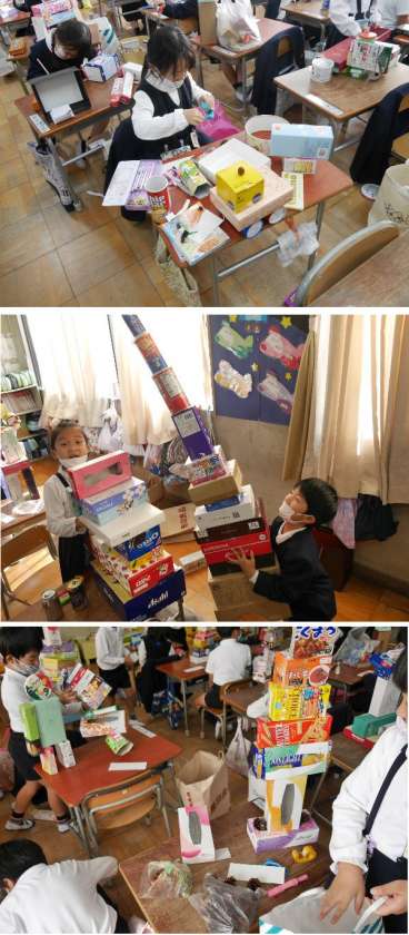 11月4日 1年図工!空き箱でつくろう 公開日 2021/11/04 更新日 2021/11/04 学校生活 1年生が、お家から持ち寄った空き箱で作っています。とても大きな作品ができそうですね。いろんな空き箱があって、上手にその形を利用して作っています。 いいね(0)