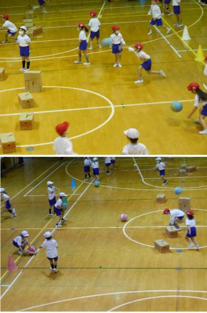 1年生では、ボールをつかった運動をしています。ボールをけるから、ボールを投げる運動をしています。体育館で段ボールにあてる練習をしています。上手に投げられると、いろんなゲームができるようになりますよ。