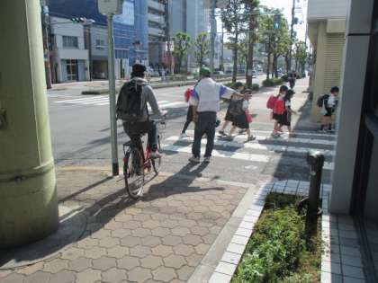 上の写真は、歩道橋下の見通しの悪い場所で、しかも通勤の自転車がビュンビュン行き交うところです。