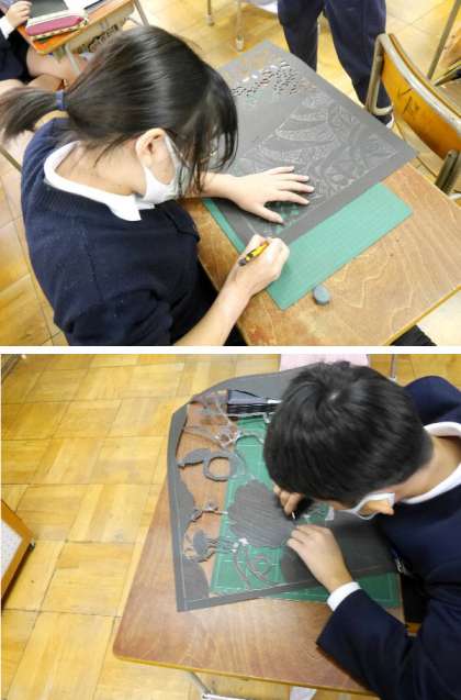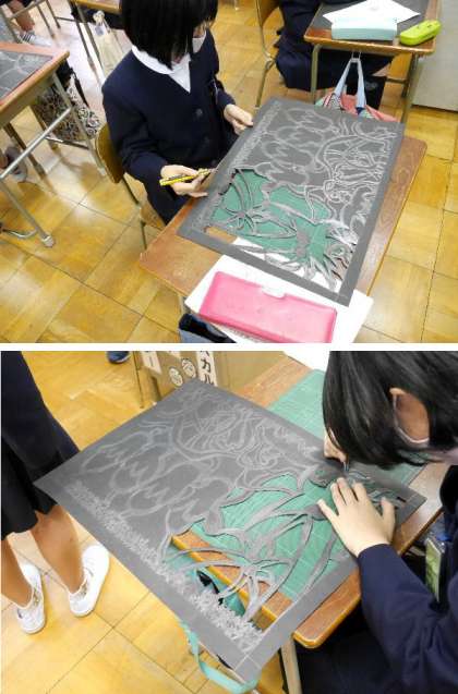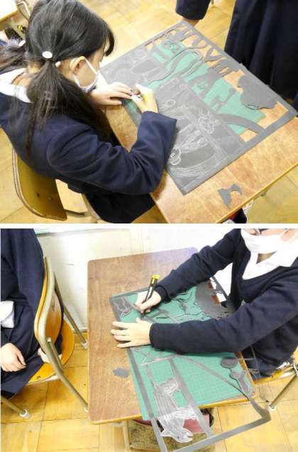 5年生では切り絵を作っています。複雑な絵を考えてカッターで切り抜きます。気を付けて作業しましょう。黒紙がかっこよく浮かび上がってきますね。