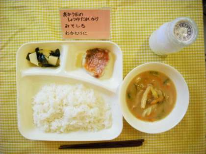 今日の献立は、「赤魚のしょうゆだれかけ、みそ汁、わかたけ煮、ごはん、牛乳」です。1年生の教室で「今日の魚は、皮が赤い赤魚ですよ。」と言うと「鯛かと思った」と言う子がいました。皮が赤い魚といえば、まず鯛を思い浮かべますね。でも大阪市の給食では、値段や骨の心配などがあるので、鯛はまだ出てきていません。赤魚もクセがなく旨みのある魚です。 わかたけ煮は、春に収穫される新わかめと新たけのこの季節にあわせて毎年5月に出てくる献立です。