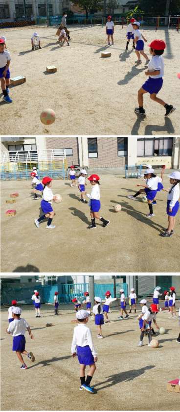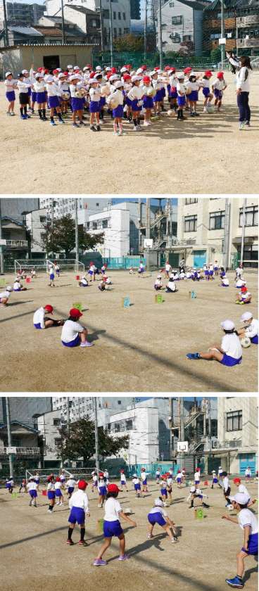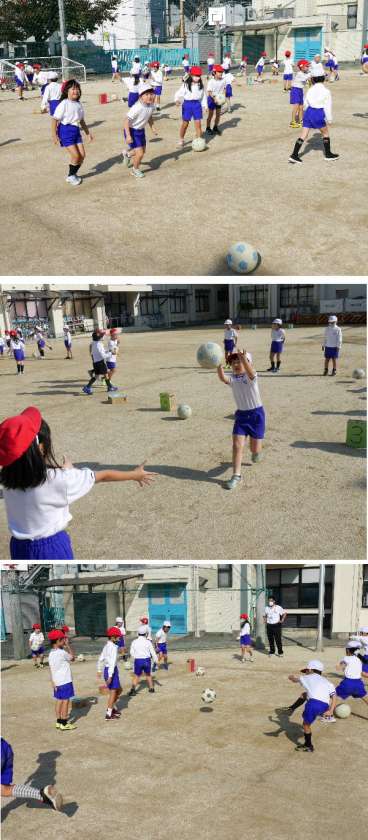 1年生が、運動場でボールを使った運動をしています。先週は雨が多かったですが、今日は秋晴れの気持ちいい天気でした。