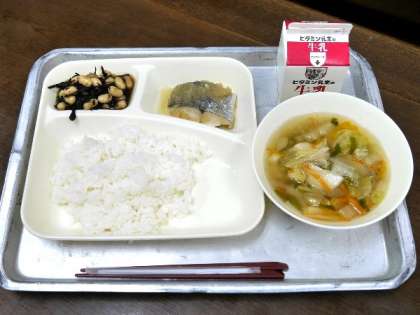今日の献立は、さごしのおろしじょうゆかけ、サトイモのすまし汁、大豆の煮もの、ごはん、牛乳でした。