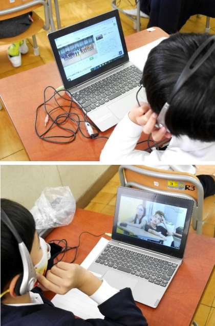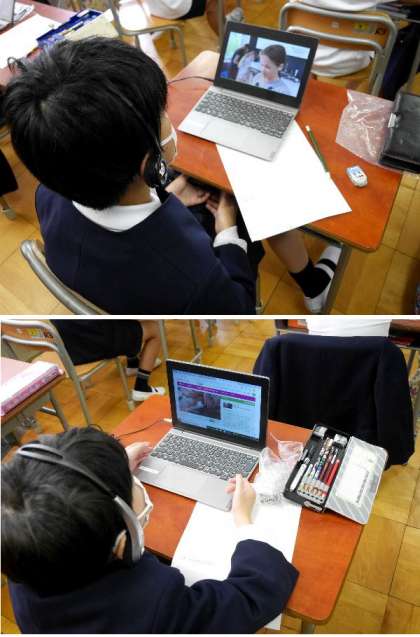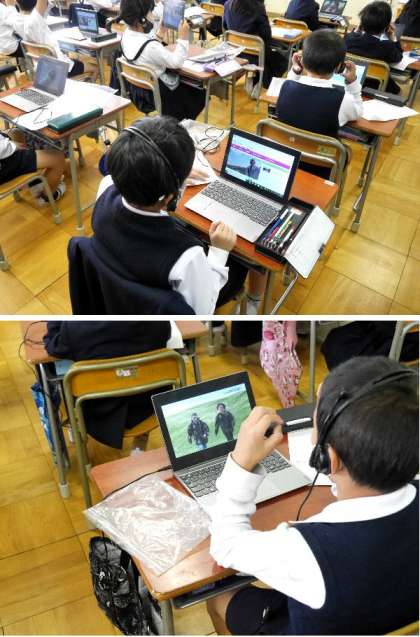 2年生が、一人一台のパソコンで、NHKスクールの動画を鑑賞していました。ヘッドフォンで静かに見ています。いろいろな使い方ができます。