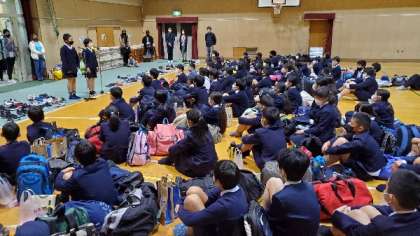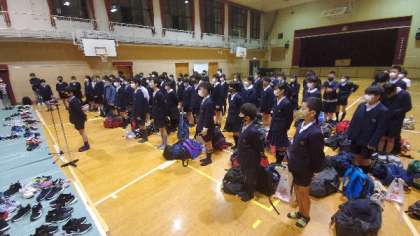 学校に到着しました。たくさんの保護者方々のお出迎えありがとうございました。