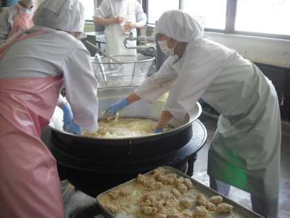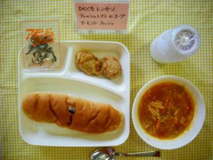 今日の給食は「一口トンカツ、フレッシュトマトのスープ、アーモンドフィッシュ、レーズンパン、牛乳」です。トンカツは角切りの豚肉に、ワイン、塩、オールスパイスで下味をつけ、衣とパン粉をつけて油であげる人気メニューです。今日は、15kgの肉を給食室で揚げました。3年生の教室では、2個ずつ配った後、余ったトンカツのおかわりジャンケンが大盛り上がりでした。