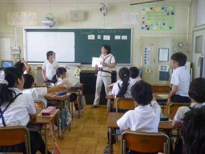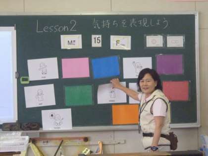英語活動の授業の様子です。イギリス人の先生による授業の時もありますが、基本は担任等による授業です。フォニックスや文字指導もとり入れ楽しく授業をしています。今日の5年生は、気持ちを英語とジェスチャーで表現する学習をしました。