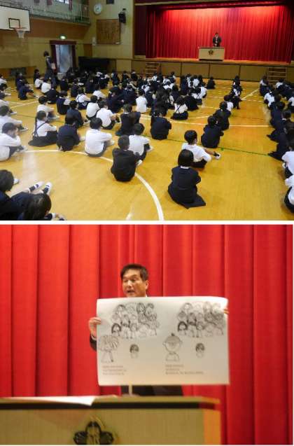 今日の全校朝会では、絵本「わたしのせいじゃない〜せきにんにんについて〜」を紹介しました。クラスで泣いている子の前で、みんなが、「わたしのせいじゃない」「ぼくはしらない」「少しだけ」など口々に話をしています。