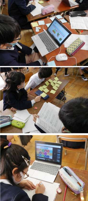 5年生では資料を活用して報告するための作業をしています。ずっと、食品ロスについて、調べたり考えています。