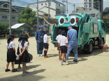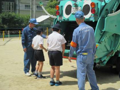 今日は環境事業局の方がパッカー車君を引き連れて来ていただきました。