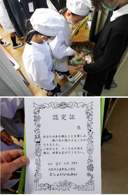 図書委員が、たくさんの本を読み切った児童に表彰を手渡して、手作りのしおりを渡していました。うれしいですね。