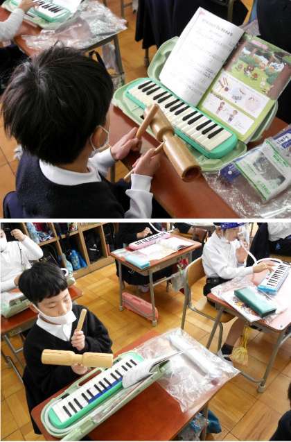 2年生では、鍵盤ハーモニカ以外にもいろんな楽器を歌にあわせて楽しみながら演奏しています。