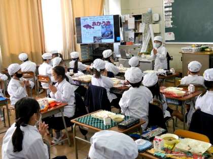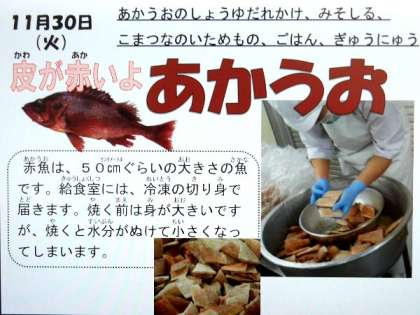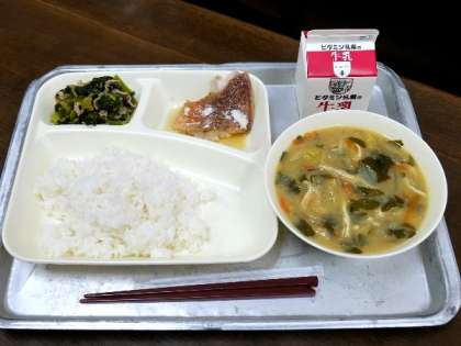 今日の献立は、赤魚のしょうゆだれかけ、みそ汁、小松菜の炒め物、ごはん、牛乳でした。