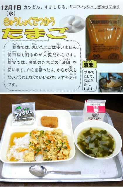今日の献立は、カツどん、すまし汁、ミニフィッシュ、牛乳でした。