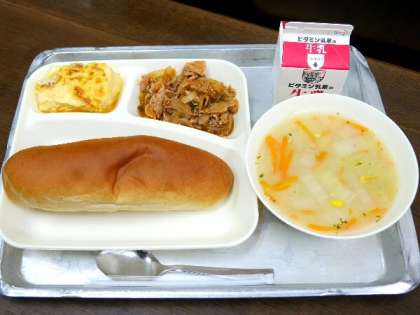 今日の献立は、豚肉のケチャップソテー、コーンスープ、焼きプリン、黒糖パン、牛乳でした。