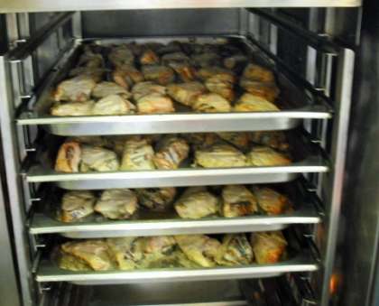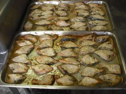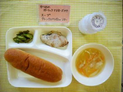 今日の献立は、「かつおのガーリックマヨネーズ焼き、スープ、グリーンアスパラガスのソテー、ライ麦パン、牛乳」です。かつおは、1人1切れずつです。マヨネーズとにんにく、塩、白こしょうで下味をつけ、焼き物機でこんがり焼きました。マヨネーズの味でかつおがおいしく食べられました。