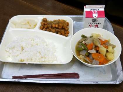 今日の献立は、鶏肉と野菜の煮物、じゃこ豆、かぶのゆず風味、ごはん、牛乳でした。