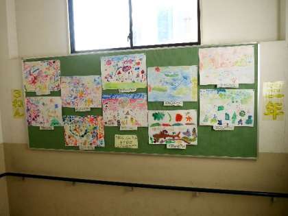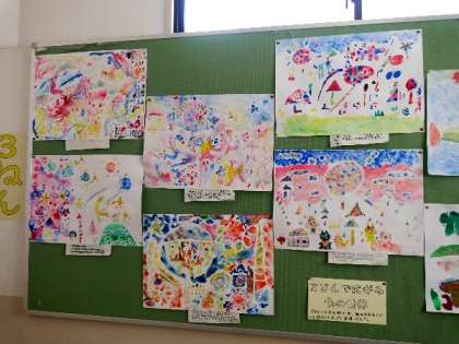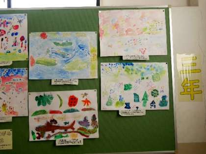 3年生の掲示板には、絵具のにじみで描いた絵が掲示されています。
