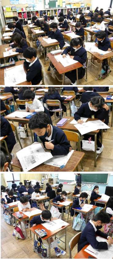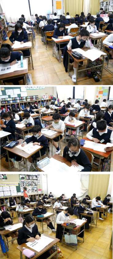 大阪市の経年テストが、3年生〜6年生の各教室を実施されました。今日は、国語と社会です。明日は、算数と理科と英語があります。がんばってくださいね。