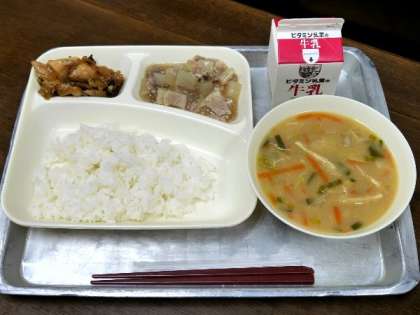 今日の献立は、鶏肉の甘辛焼き、みそ汁、大根の煮物、ごはん、牛乳でした。