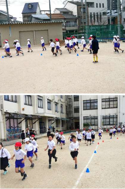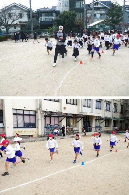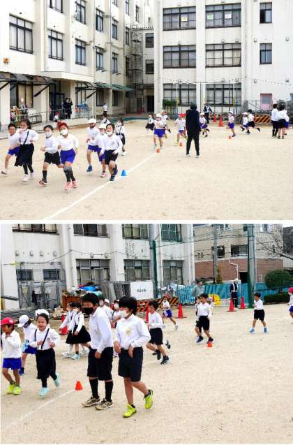 今日は1年生の業間かけ足の日です。1年生が元気いっぱいのびのびとかけっこしています。がんばってますね。