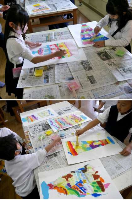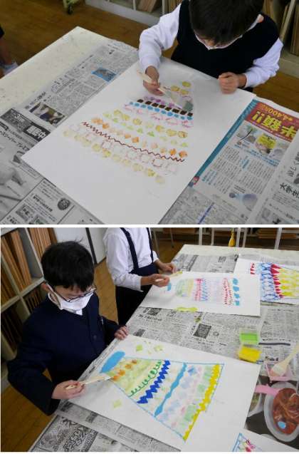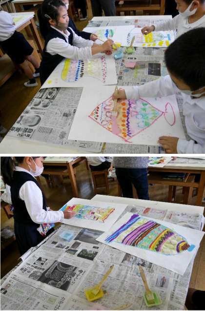 1年生では、パフェの絵をいろいろな手法で描いていってます。最後は絵具をぬって完成です。クレヨンで描いたところはうまくはじいて、きれいなパフェが完成です。